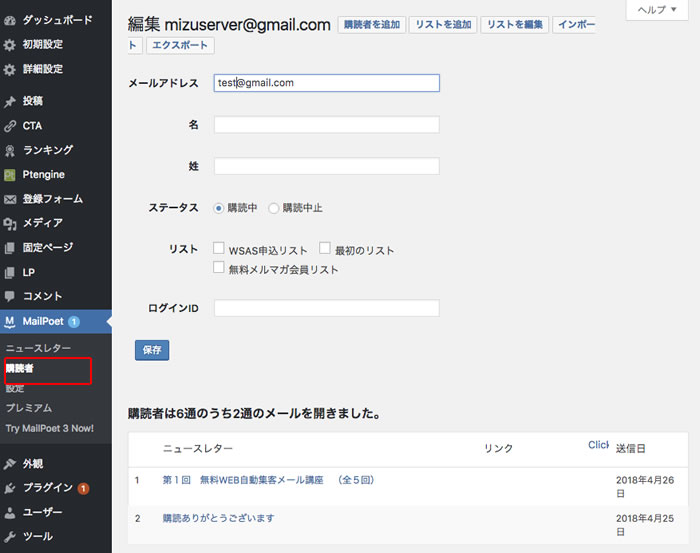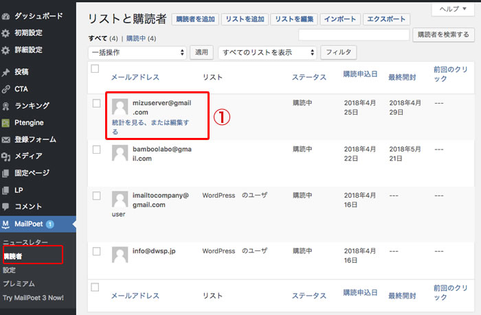 ◆「MailPoet」の「購読者」の「「各購読者の統計を見る」の画面