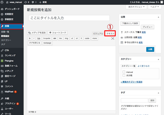 ◆「投稿ページ」作成画面の「テキスト」エディター画面